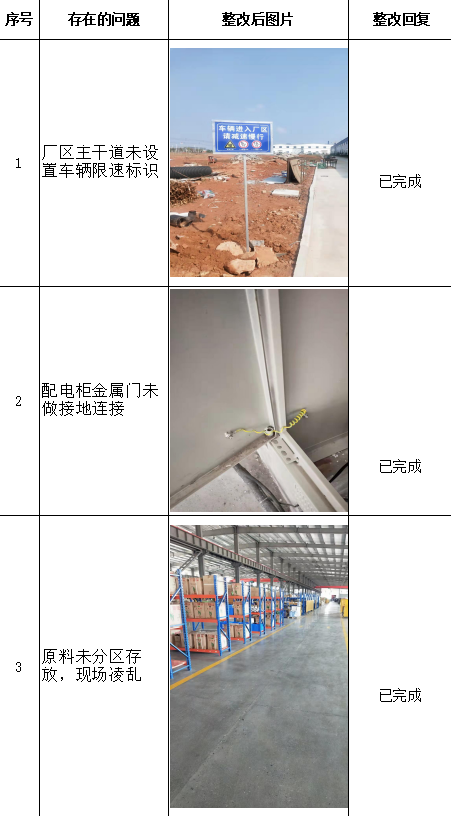 江西沃爾肯智能裝備科技有限公司針對(duì)評(píng)價(jià)組提出的上述問題,認(rèn)真研究對(duì)策措施,制定整改計(jì)劃,切實(shí)落實(shí)整改措施,項(xiàng)目評(píng)價(jià)過程中發(fā)現(xiàn)的安全隱患已基本整改到位,整改情況如下表: